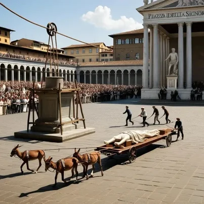 A massive wagon drawn by three mules entered the square, carrying a monumental sculpture. At the front, with piercing eyes and commanding presence, stood Michelangelo Buonarroti.