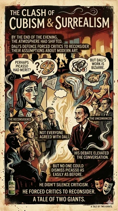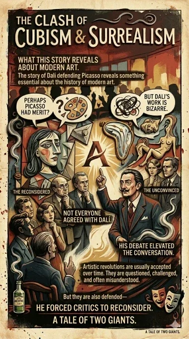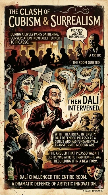 With theatrical intensity, Dalí defended Picasso as a genius who had fundamentally transformed modern art. He argued that Picasso wasn’t destroying artistic tradition—he was rebuilding it in a new form.